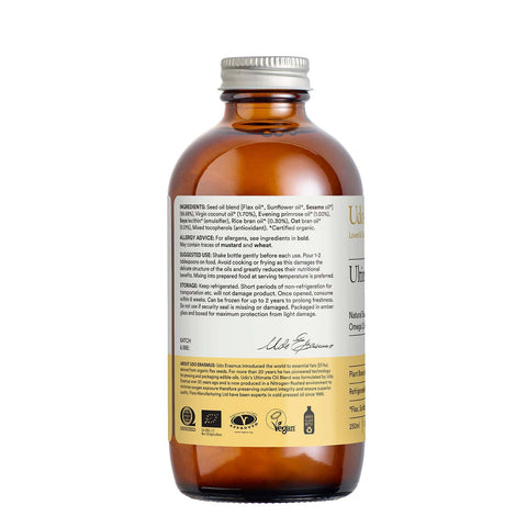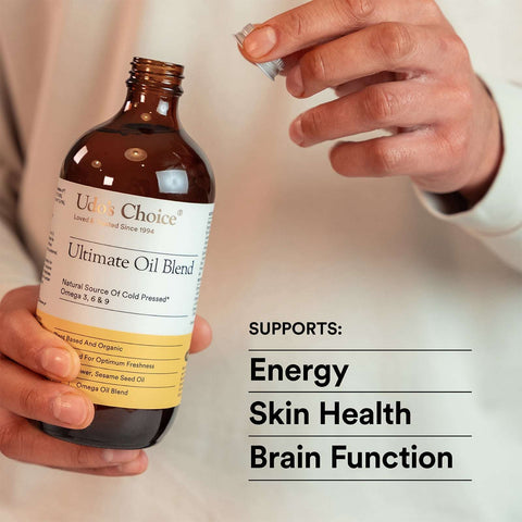Udo's Choice Ultimate Oil is the original, an internationally award-winning cold-pressed blend of organic seeds. Delivering plant-based omega 3, 6 & 9 undamaged full chain Essential Fatty Acids in the right ratio for optimum foundation health, growth & development.